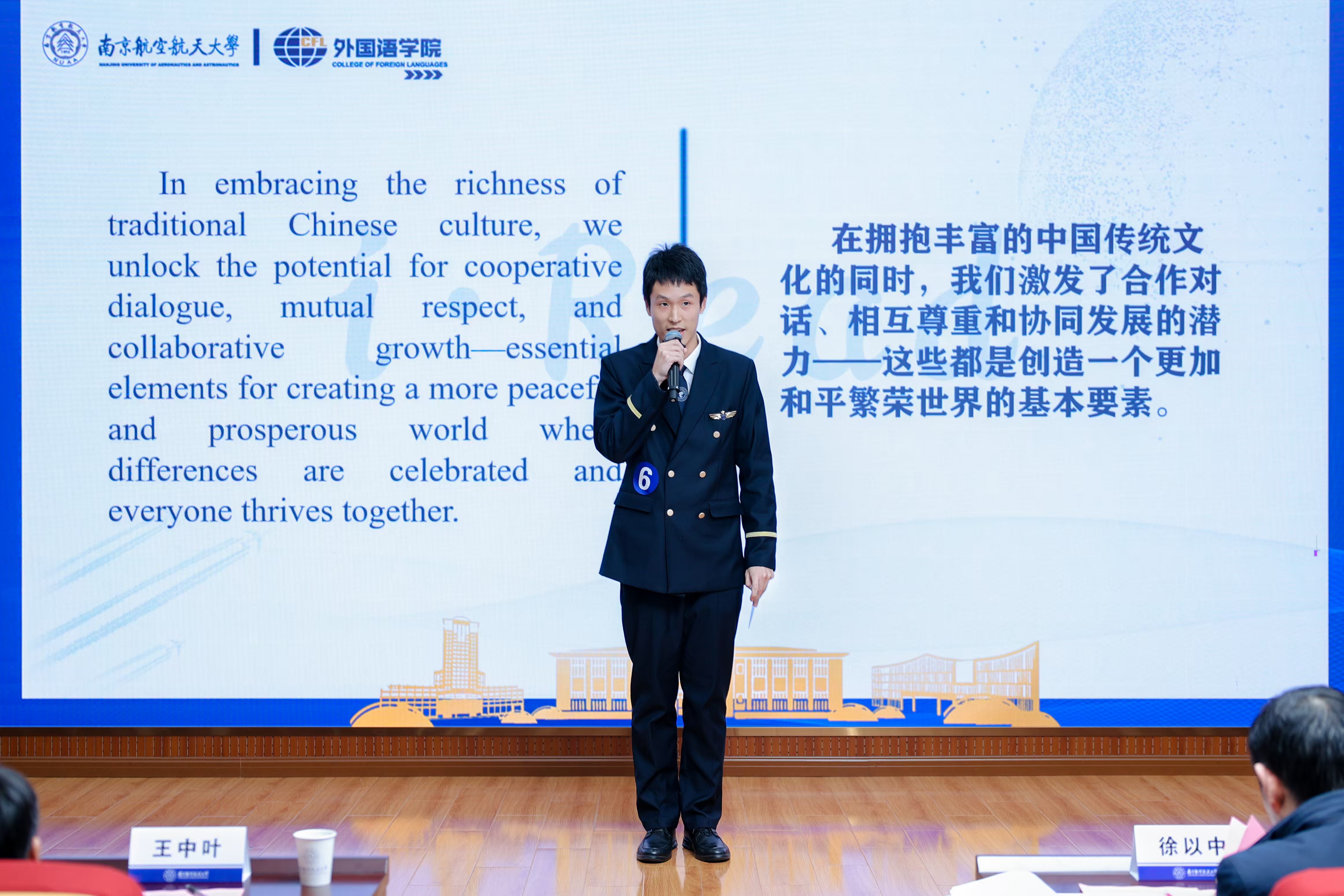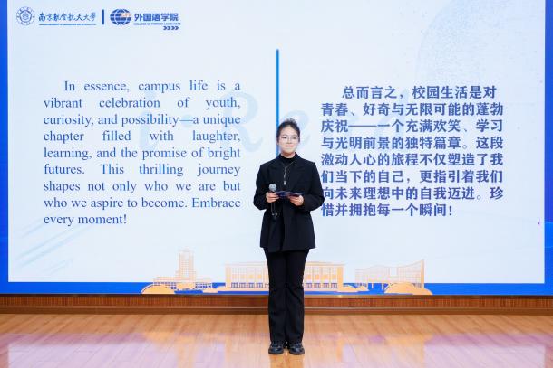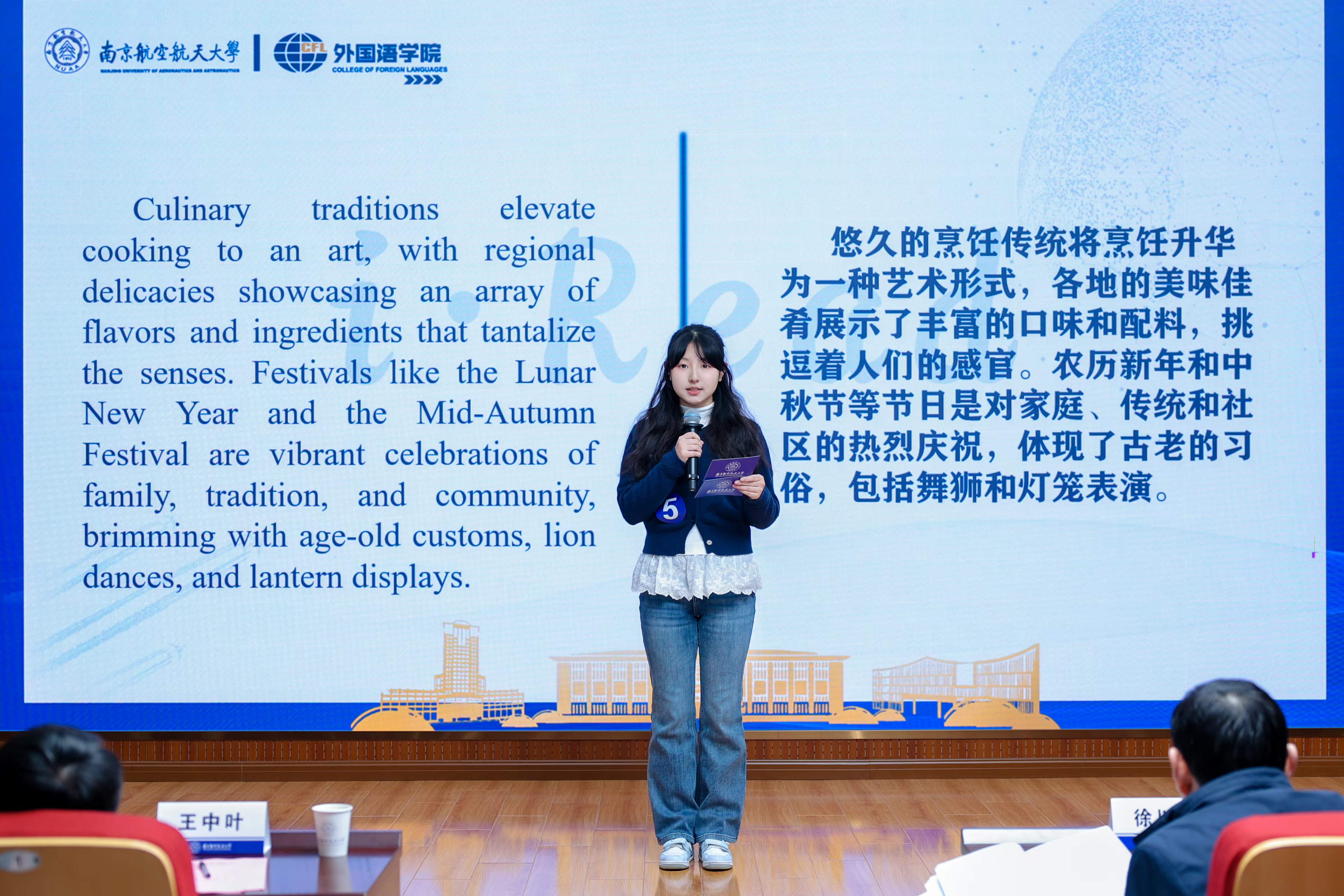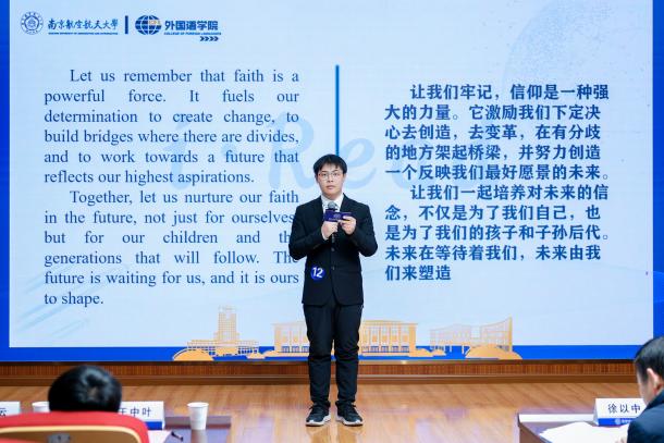 为保证公平公正,大赛采用了人工智能和教师评委协作双重评分的机制,在初赛阶段引入科大讯飞FIF口语训练系统,在AI判听的基础上,洞洞杂货店 组织英语专业教师对参赛作品进行专业复核。决赛第一轮朗诵环节,12强选手以标准的语音朗读了许多英语名篇。随后,6强选手产生并进入决赛第二轮——百秒图说南航环节。他们用流利的英语口语和准确的英语表达,向评委和观众们讲述图片背后的南航故事,传承南航校训校风精神。决赛过程中,一张张承载南航重大发展时刻的图片唤起嘉宾评委和同学们的共同回忆,选手们的高水平发挥也赢得了嘉宾评委和同学们的欢呼喝彩和热烈掌声。