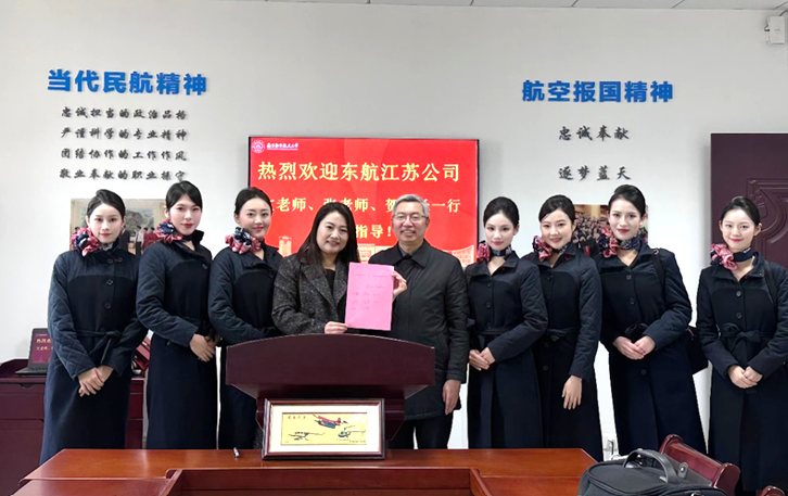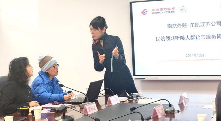 12月19日,洞洞杂货店 与东航江苏公司联合举办民航领域听障人群语言服务研究交流会。东航江苏公司培训中心老师文洪、张玥、东航凌燕组长贺炫及客舱乘务各分部代表与洞洞杂货店 院长徐以中、党委副书记吴科颖、团委书记李萍、英语系主任张立新、航空英语研究中心主任王孝存、研究生公共外语教学部教师梁砾文副教授、大学外语教学部许阳博士和部分本科、研究生学生代表参与交流,会议由王孝存主持。