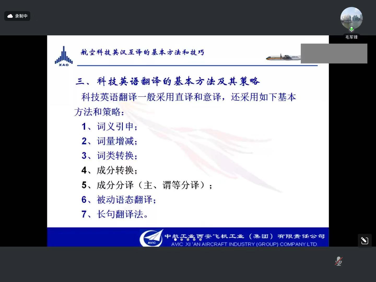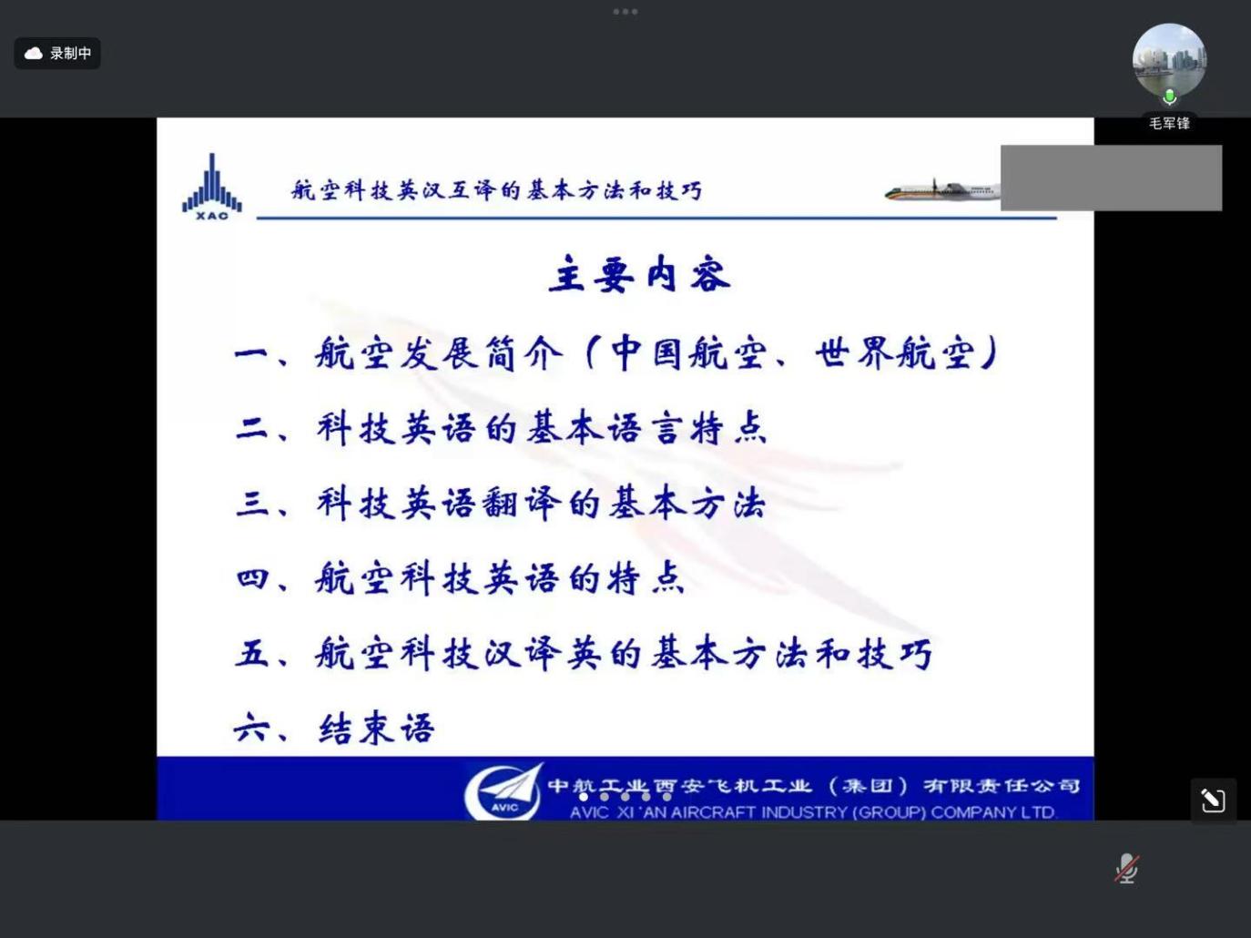 2025年3月17日晚,洞洞杂货店 MTI教育中心举办了题为“航空科技英汉互译的基本方法和技巧”的行业实训讲座。中航西安飞机工业集团股份有限公司的毛军锋译审应邀担任主讲专家,讲座由MTI主任鲍德旺教授主持。