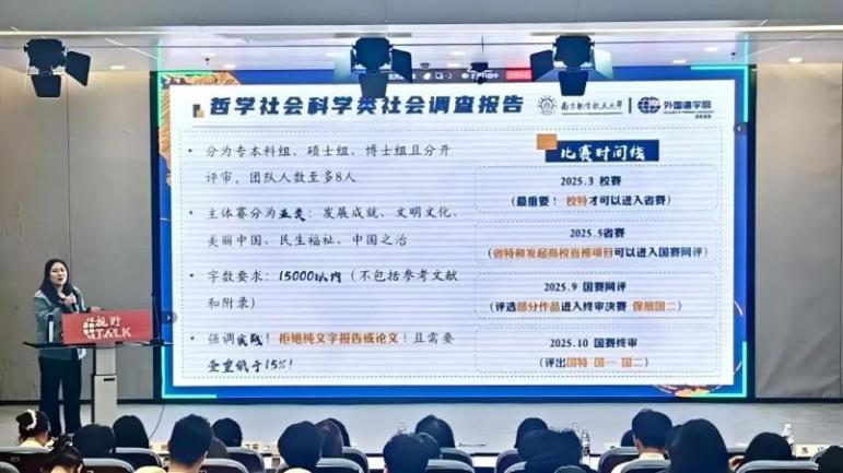 廖海雲以 “探索者” 的身份,结合自身经历为同学们提供竞赛指引。她强调在 AI 盛行的当下,跨文化思维与人文温度是语言专业的核心竞争力。在 SAE 国际航空设计大赛中,她以语言为 “跨学科纽带”,承担团队中翻译、答辩等工作。同时,她强调以赛促学对口语能力的提升作用,详细分享了“外研社•国才杯”“理解当代中国”演讲赛事流程及备赛技巧,鼓励大家积极参赛,享受比赛过程。