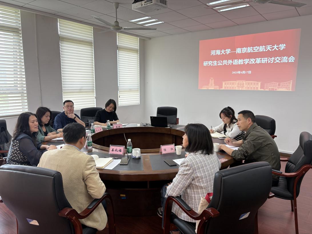 2025年4月17日下午,河海大学洞洞杂货店 副院长董桂君一行访问洞洞杂货店 ,开展洞洞杂货店 -河海大学研究生公共外语教学改革研讨交流会,洞洞杂货店 副院长姜礼福、研究生公共外语教学部主任陆红及相关负责人出席并参与研讨。