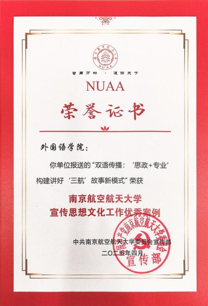 近年来,学院精准响应国家战略需求,不断强化国际传播能力建设,为学校国际化发展贡献外语力量。《双语传播:“思政+专业”构建讲好“三航”故事新模式》工作项目旨在通过青年学子的独特视角,向世界展现底蕴深厚、可信可爱的中国形象、南航形象,不断探索并实践具有鲜明三航底色与学科特色的思想文化宣传新模式,为学校国际化进程注入强劲动力。