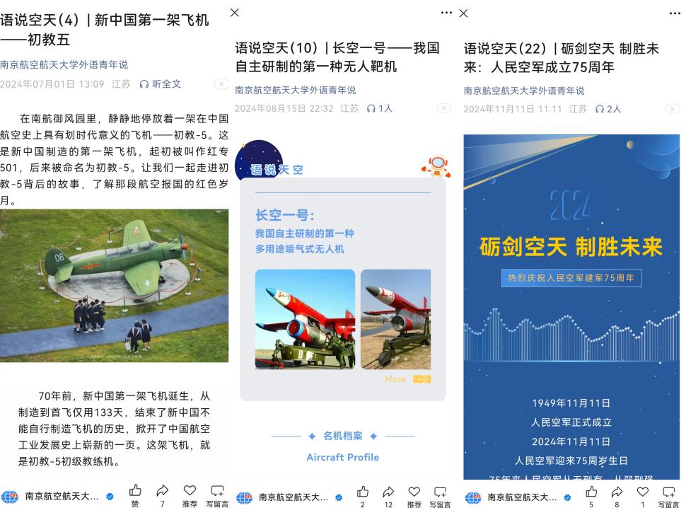 学院开展三航翻译实践,形成具有学校特色的“三航语料库”。为献礼人民空军成立75周年,团队组织学生开展“语说空天”系列翻译活动,打造具有学校特色的“三航语料库”,为三航文化的国际化传播奠定坚实基础。