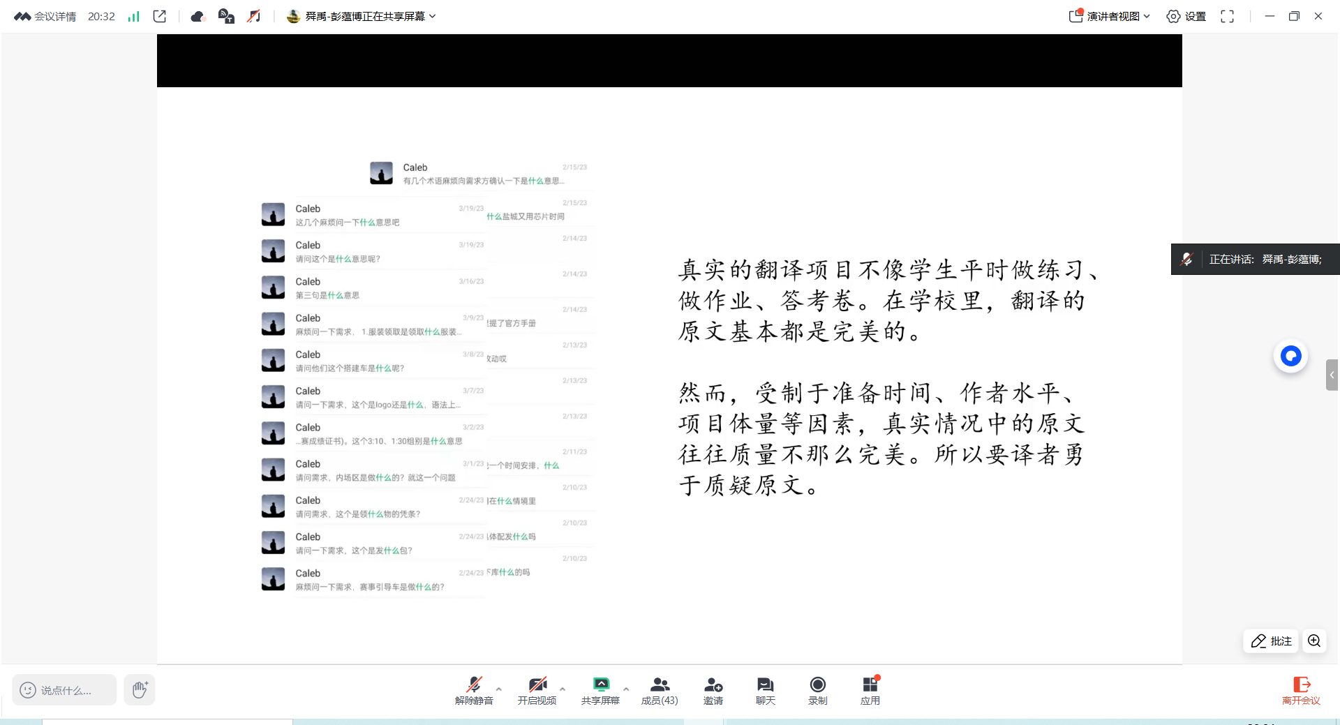 5月10日,舜禹技术部尚定强经理主讲翻译工具的运用。“工欲善其事,必先利其器”,在讲座中,尚定强认为,作为新时代的译员,翻译工具对于译者提高翻译实践能力非常重要,他梳理了翻译市场上常用的工具,通过具体的案例展示工具的操作和使用。另外,他还强调了大语言模型对于提高翻译效率与质量的重要性。