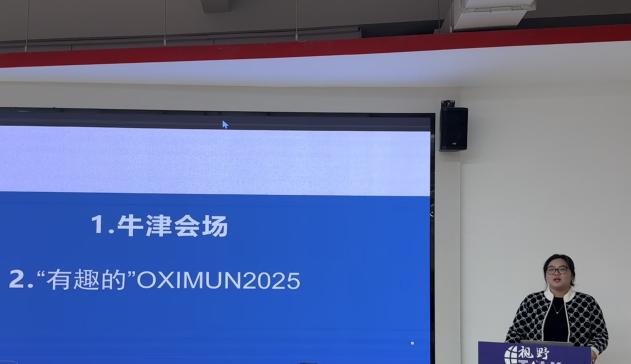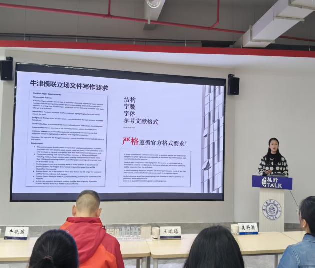 首先,牛晓然老师为同学们进行了有关模联前期培训与准备的关键要点的深度解读。牛老师从模联的含义及概况、为什么我们要去参与模联、在模联中的收获以及模联的运作机制的几个方面为同学们构建起对模联的初步认知体系。同时,牛晓然老师也向同学们展示了有关本次牛津模联的珍贵影像,强调了模联对同学们进行提升批判性思维,提升个人思考能力的巨大作用。