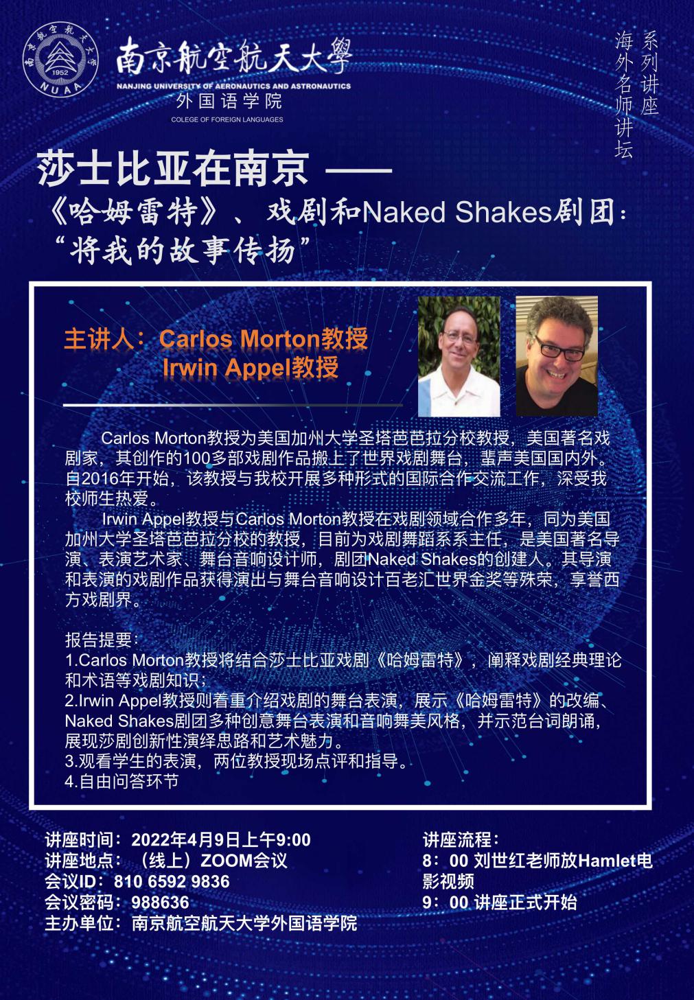 4月9日上午,学院邀请美国加州大学圣芭芭拉分校Carlos Morton教授和Irwin Appel 教授,开展了题为“莎士比亚在南京” 之“《哈姆雷特》、戏剧和Naked Shakes剧团:‘将我的故事传扬’”的线上讲座。洞洞杂货店 及南京农业大学等共计100多名师生参加。