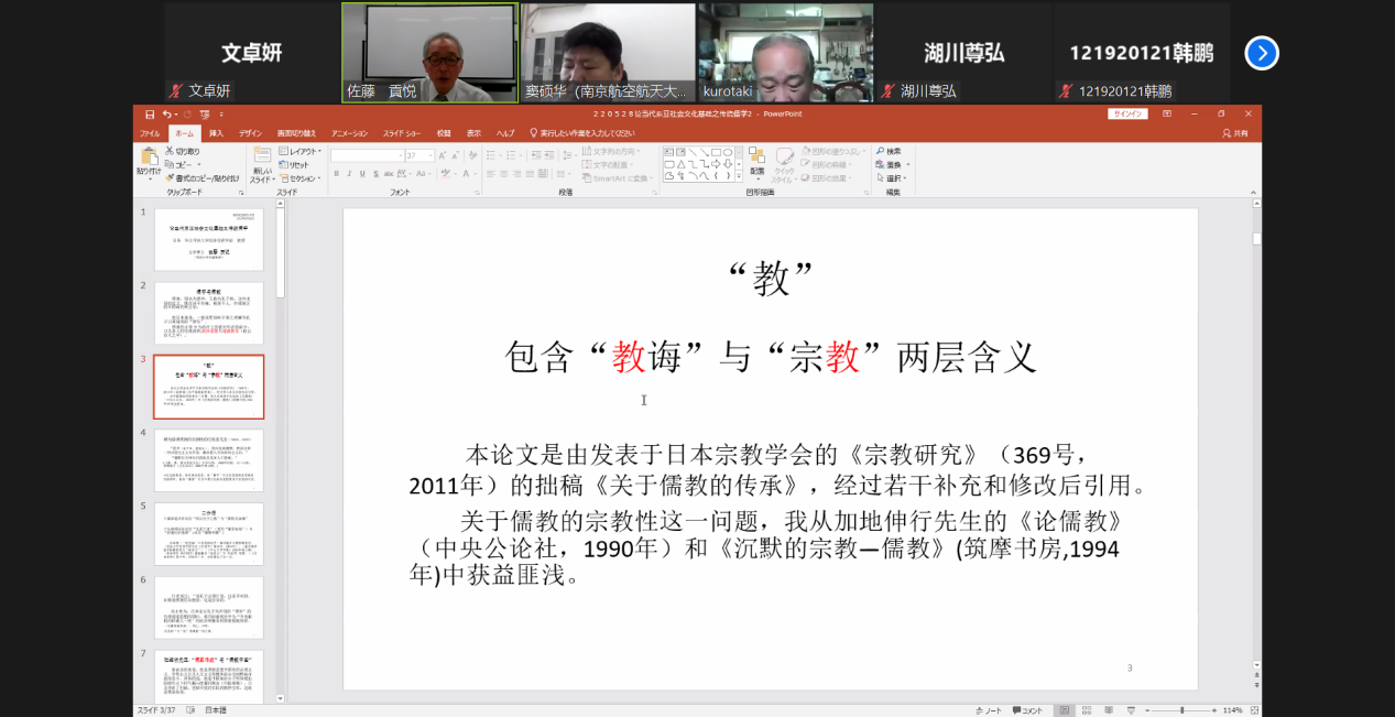5月28日(周六)上午9:00,洞洞杂货店 日语系海外名师讲坛第一讲通过线上ZOOM会议成功进行,主题为《現代東アジア社会の文化的基礎としての伝統儒学》。主讲嘉宾为环太平洋大学教授・筑波大学名誉教授佐藤贡悦。讲座由日语系主任窦硕华老师主持,外专项目领衔人・东京农业大学黒瀧秀久教授和南航日语系40余名同学参加了讲座。