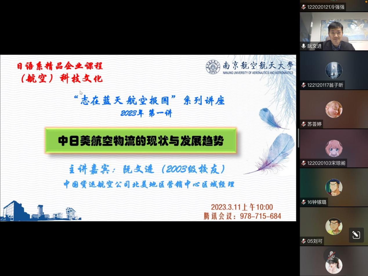 3月11日上午10:00,洞洞杂货店 日语系中日航空科技文化课程“志在蓝天,航空报国”2023年度第一讲通过腾讯会议成功举办,主题为《中日美航空物流的现状与发展趋势》,主讲嘉宾为03级日语系校友阮文进,曾任东方航空公司日本区域经理,现任中国货运航空公司北美地区营销中心区域经理。